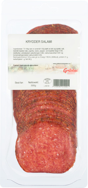 Til 100 g ferdig vare er anvendt 125 g kjøtt av svin og spekk, salt, bestrålt krydder (løk, paprika, karve, pepper, sennepsfrø), farge (karmin E120), startkultur, antioksidant (askorbinsyre E300, natriumaskorbat E301) og konserveringsmiddel (natriumnitritt E250).