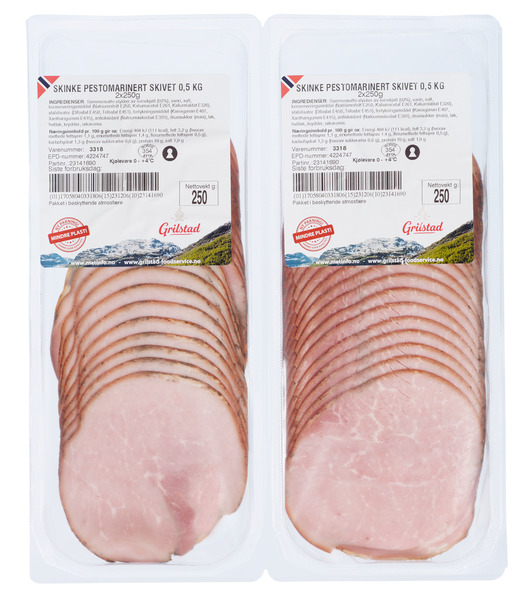 Høykvalitetspålegg med pestomarinade. Litt større skiver (14-16 g) som gjør seg utmerket på buffet eller i påsmurt. Laget med vår egen pestomarinade, som gir påleggskinken en dypt og spennende smaksavtrykk.